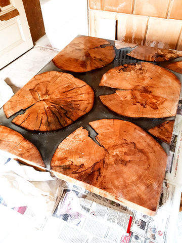 aus Holz von einem alten Hauklotz und grau-transparentem Epoxidharz mit leichtem mehligen Effekt für einen Eiswasser-Look.